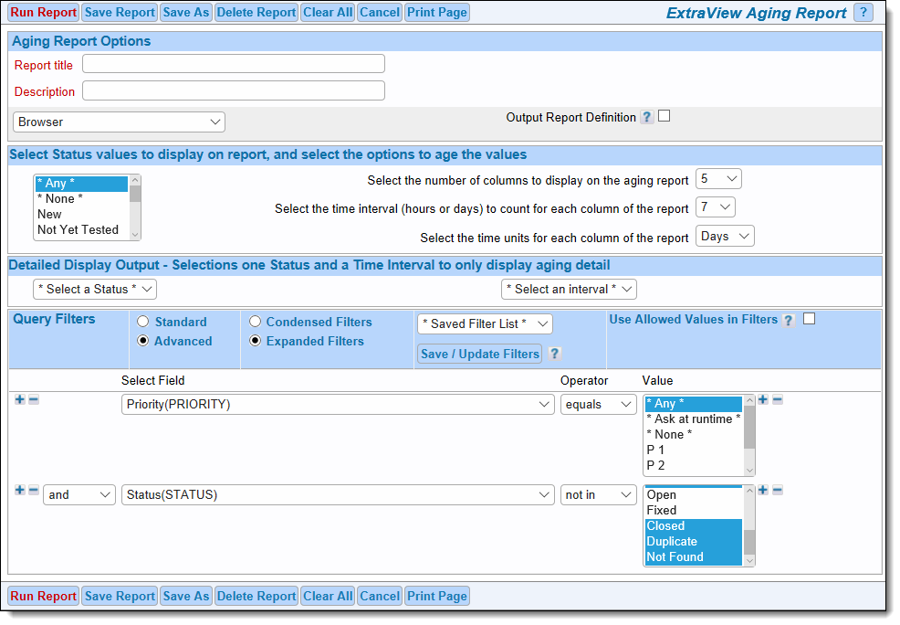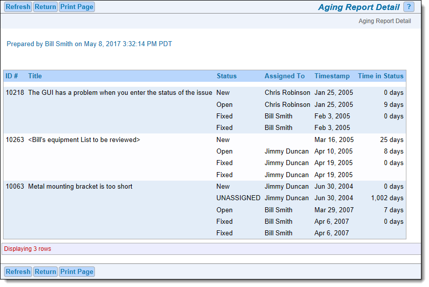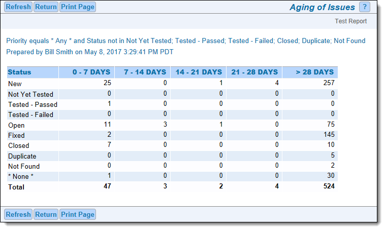 If you simply select options in the Select Status values to display on report, and select the options to age the values, the Aging Report displayed will be similar to the following screen:
