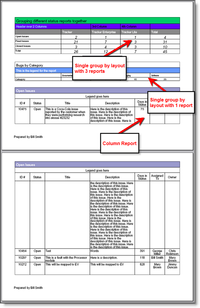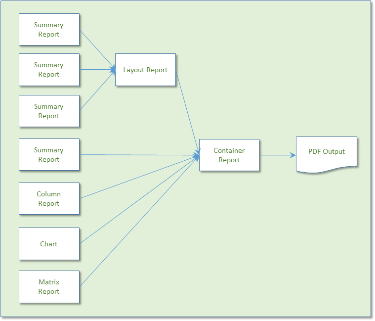 The purpose of container reports is to place the output from multiple reports within a PDF container and and allow the user to print, email or store the document. There is a process to follow in preparing container reports that is more fully described in the User Guide. As well as being able to place multiple reports within a container, you can use a special method to combine the output of several summary reports onto a single layout, and then place the results into the container report.