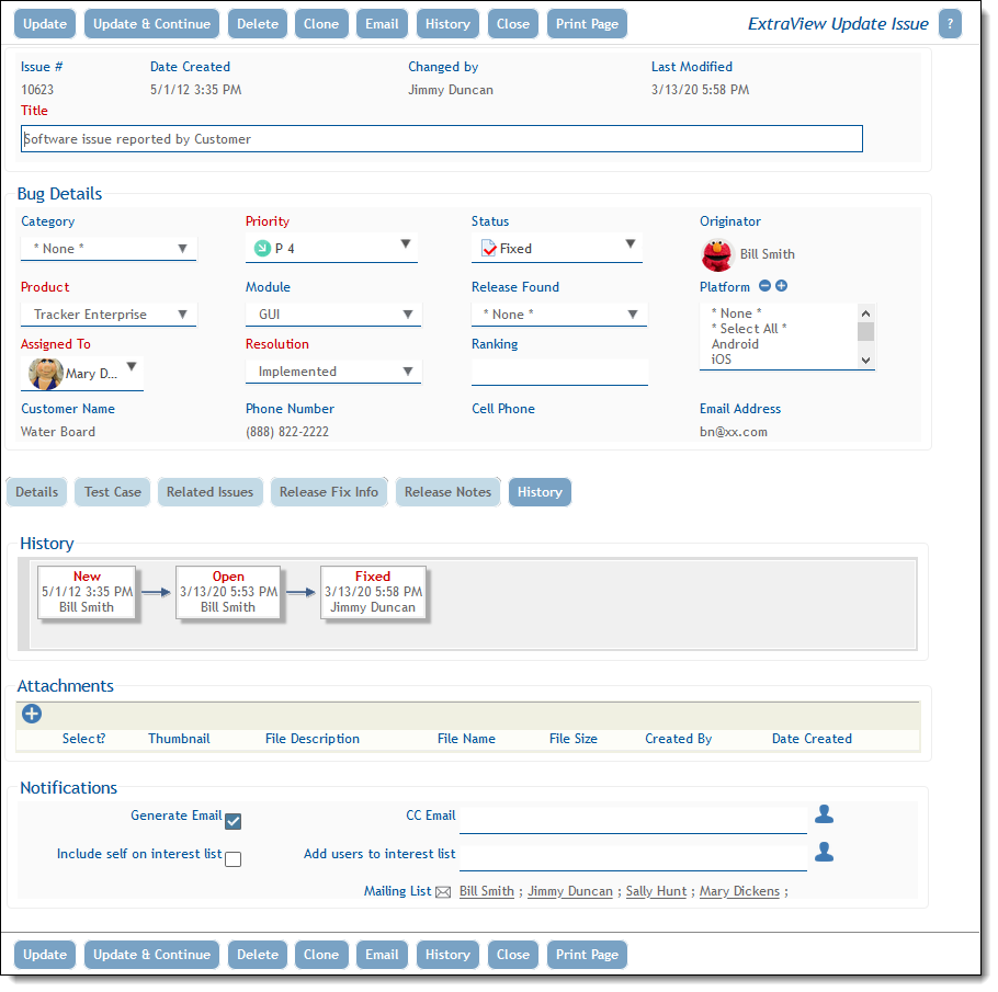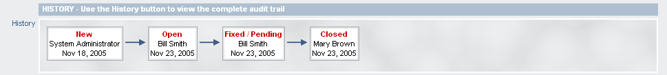 ExtraView retains a complete record of all changes to every issue. This allows you to audit the history of changes from the time the issue is first entered until final closure.