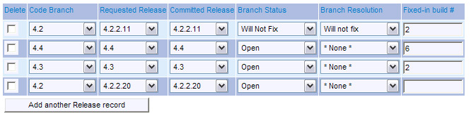 When you are editing an ExtraView Issue you may have the opportunity to add another repeating record to an existing issue. For example, if you are tracking software defects, you may want to track the issue against more than one release or version in which the issue is found. The specific fields available may differ from installation to installation.