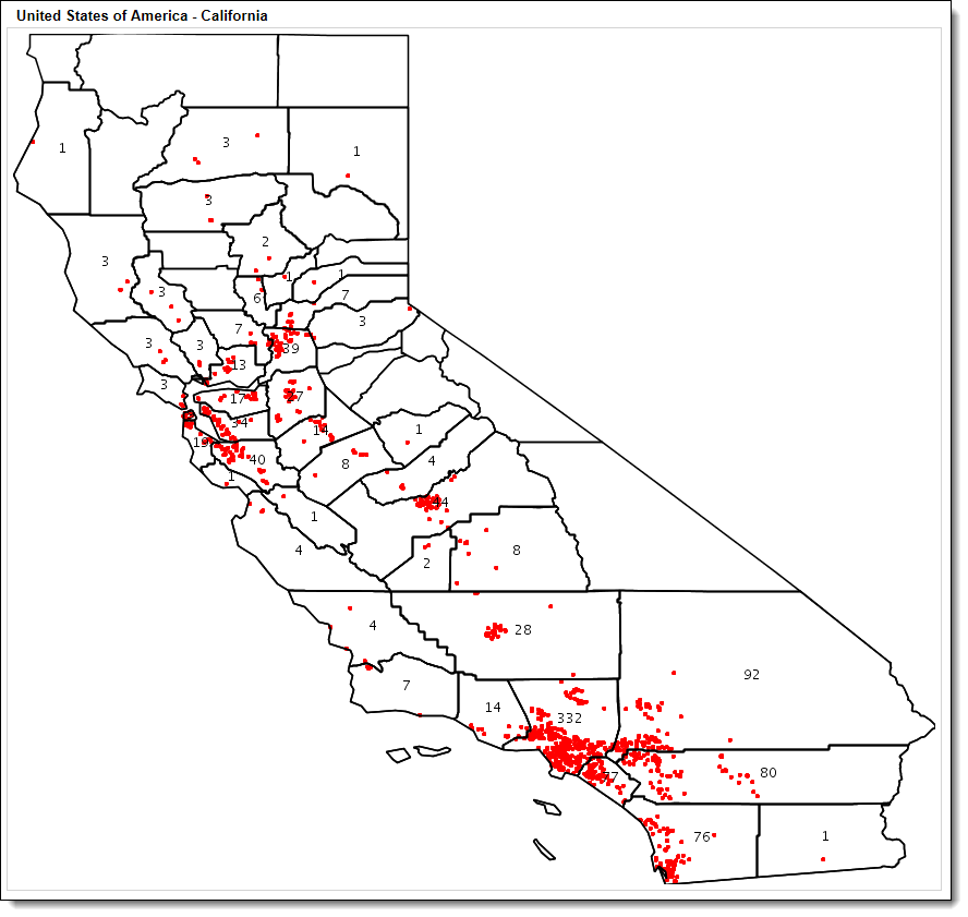 The map below shows how a single colored dot is placed at the location of an issue, in this case within Counties of the State of California. These maps are static and can be viewed within your browser, or used to produce a PDF report.