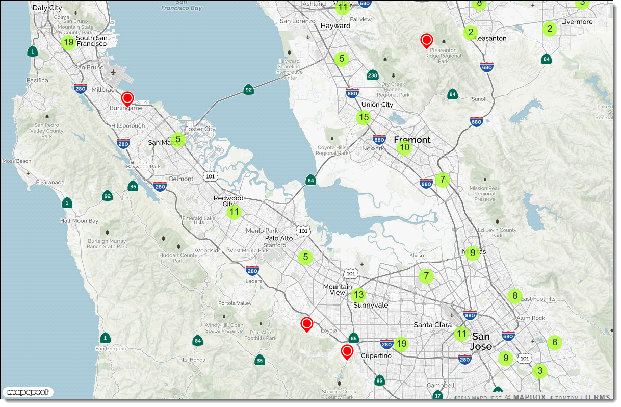 Following is a typical interactive heat map. The numbers with a green background represent the number of issues at that location. The red pointers are used when there is a single issue at a location. Holding your mouse over one of these will show more details, and you can click with your mouse on these to produce a Quicklist with the details of the issues at that location. You may zoom in and out using the thumb wheel of your mouse.