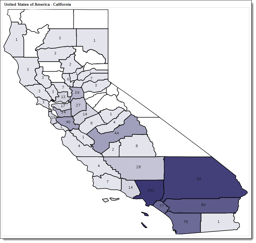 The map below shows how shades of a color will provide an indication of how many issues exist within each boundary, in this case the Counties of the State of California. These maps are static and can be viewed within your browser, or used to produce a PDF report.