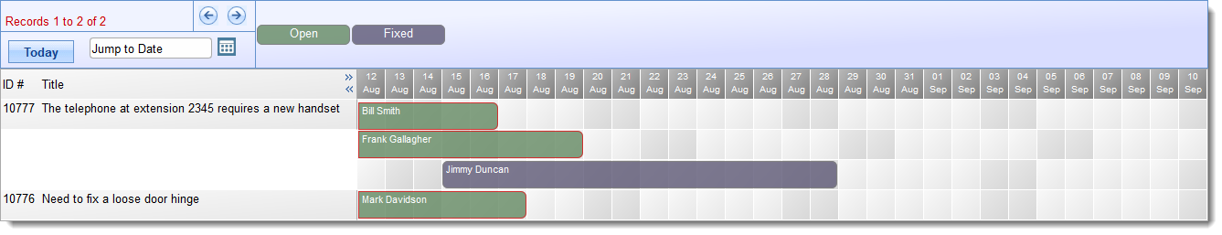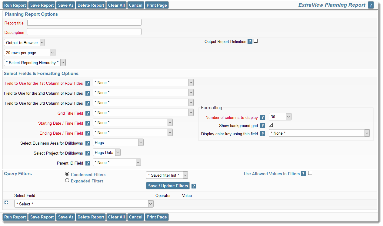 Planning reports require an ExtraView configuration with parent records that have child records. The child records require the configuration of two date fields, a starting date/time field and an ending date/time field. The planning report will present the parent issues defined by the filters set in the report editor, with each of the child issues being displayed horizontally on a grid, where the horizontal axis depicts a timeline. Each child issue is displayed with a block, defined by the start and end dates. The planning report allows the user to move the child issues horizontally, thereby updating the underlying start and end dates. The timespan between the dates can also be altered by stretching or shrinking the width of the child issue on the screen.