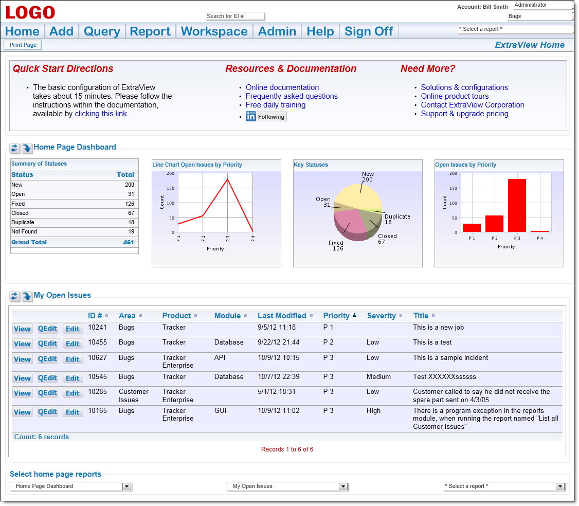 The standard interface offers a traditional way to interact with Extraview, with a navigation bar at the top of the screen. When you click a button on the navigation bar, the entire screen refreshes, and you are able to work within the function of the button you clicked. For example, you click the Add button, and you enter a new issue on the screen, or you click the Reports button to create and run reports.